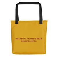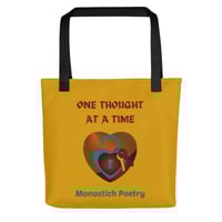 Enhance your poetic journey by personalizing your new favorite tote with a monostich poem, inspired by the interactive book "One Thought at a Time - Monostich Poetry". Add your own creative flair with up to 65 characters for your stanza and make a unique statement that reflects your poetic spirit. The perfect gift for any wordsmith, writer, poet, or author!